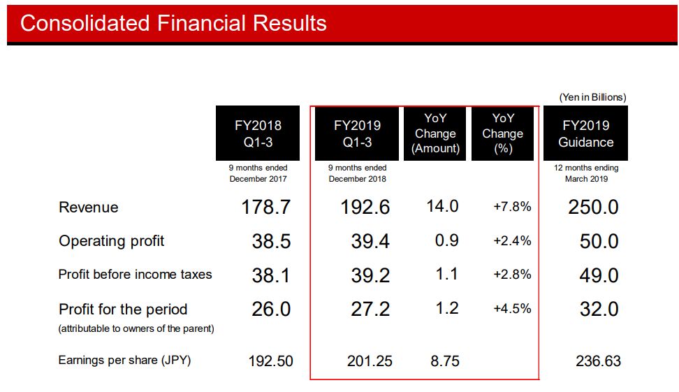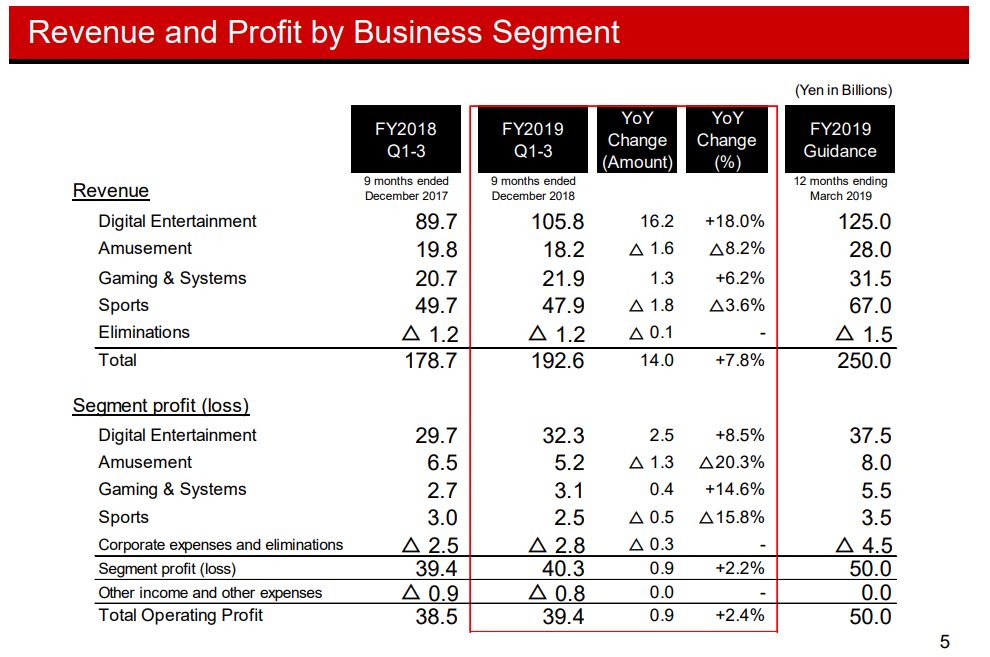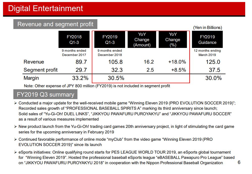 “In terms of the business results of Konami Group for the nine months ended December 31, 2018, both total revenue and operating profit exceeded those for the same period of the previous fiscal year because our soccer and baseball series titles in the Digital Entertainment business continued to perform strongly, while the Amusement business was weaker compared with its healthy sales of leading titles for the same period of the previous fiscal year.”