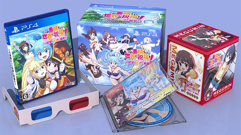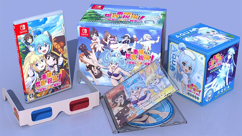 We also get to see the limited edition which includes a soundtrack CD, stereoscopic 3D glasses that can be used with a bonus minigame, a special box, and an SD figure. The PS4 version has Megumin, while the Switch version has Aqua.