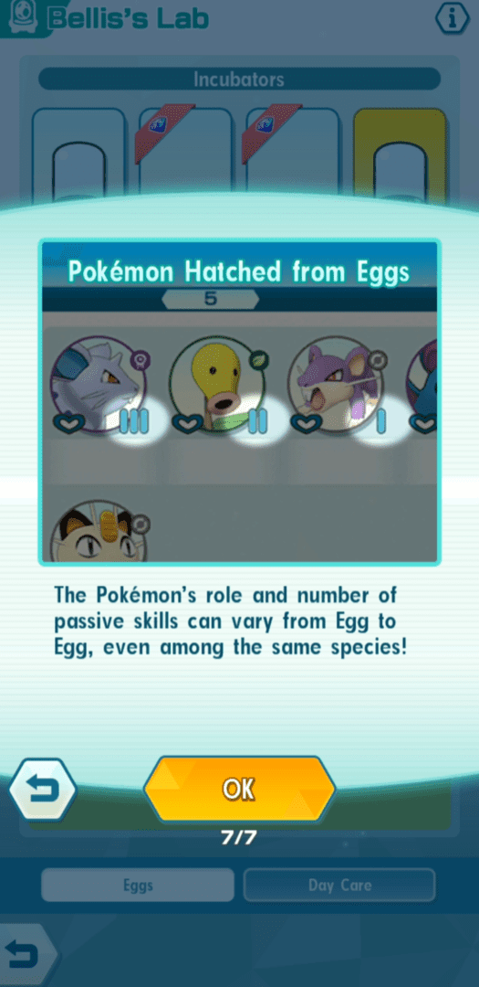 After completing certain battles in the Main Story or Training Area, players will be able to obtain Eggs from a new area in the game—Professor Bellis’s Lab. Eggs placed in incubators in Professor Bellis’s Lab will hatch after players complete a certain number of battles. Pokémon hatched from Eggs can have different battling roles and passive skills, even if they are the same Pokémon.