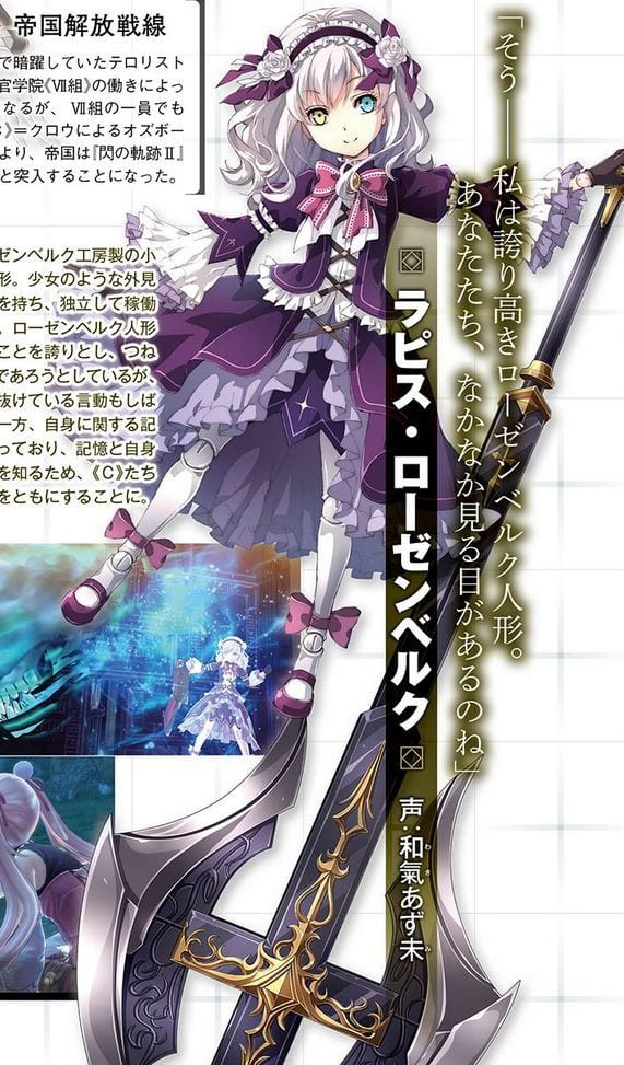 The second character is Lapis Rosemberg, a Rosemberg doll with the appearance of a young girl who can operate independently. She is proud of her nature and always tries to be elegant, even if she exhibits unusual behaviors at times. She has lost her memories and she works with “C” in order to regain them.
