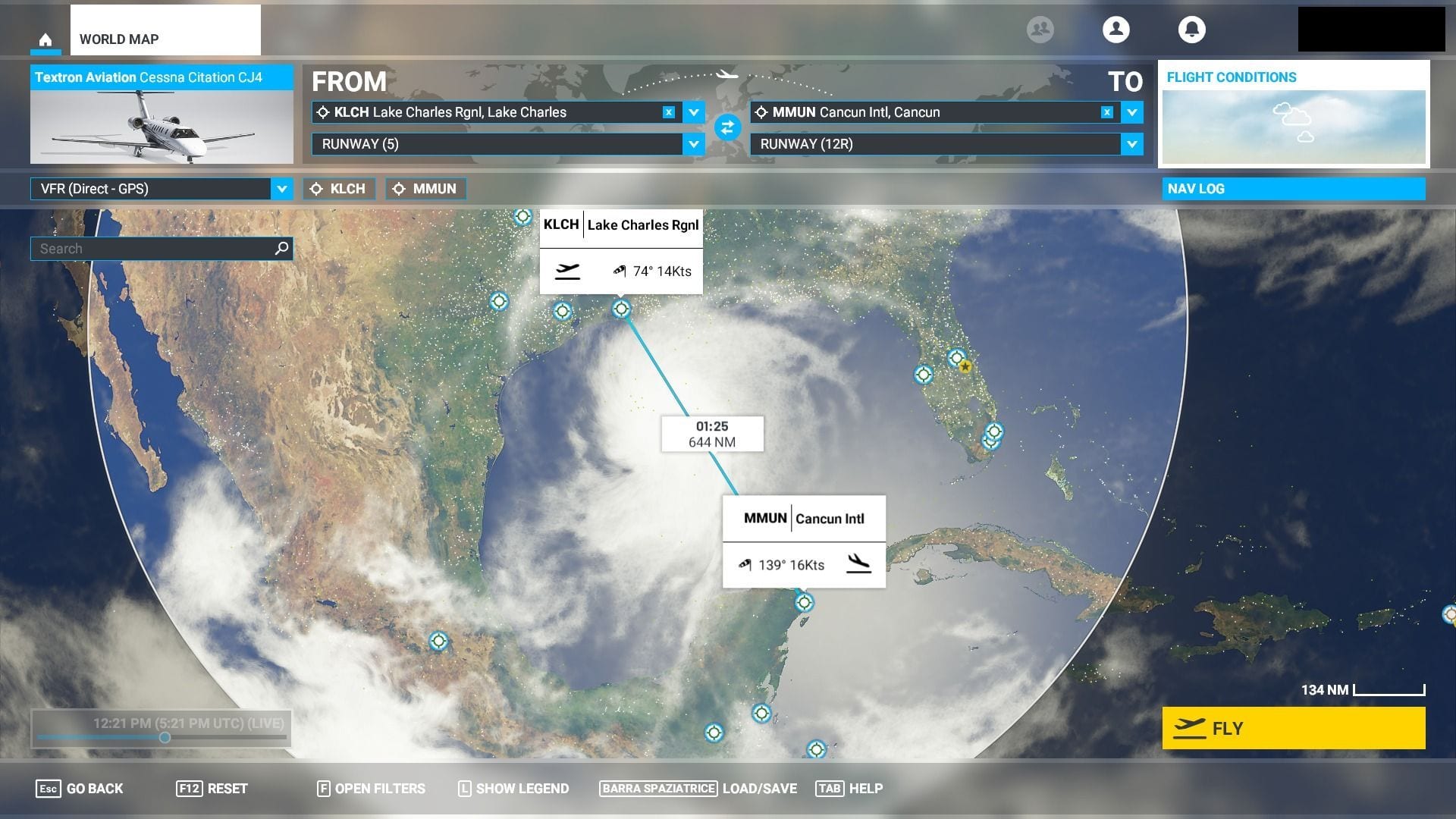 To show you what it looks like, I jumped into an old trustworthy Cessna Citation CJ4, then drew a quick and dirty plan from Lake Charles Regional Airport (KLCH) to Cancun International Airport (MMUN) straight into the middle of Hurricane Laura.