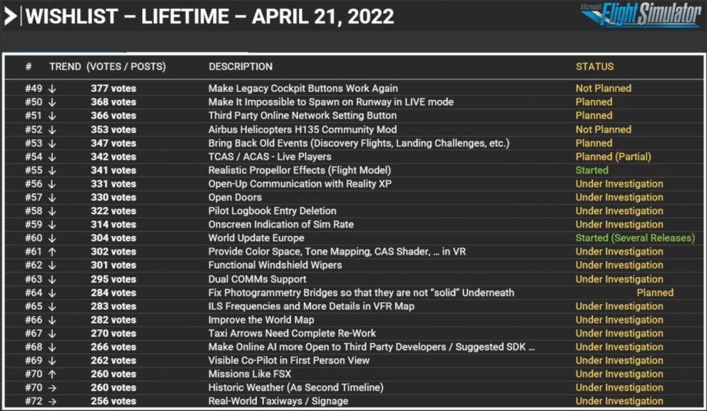 Below you can see the updated wishlist, and interestingly we hear that the Antonov An-225 Mriya is now planned as a Local Legend aircraft. It used to be the largest aircraft in the world before its destruction during the invasion of Ukraine.