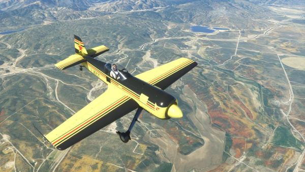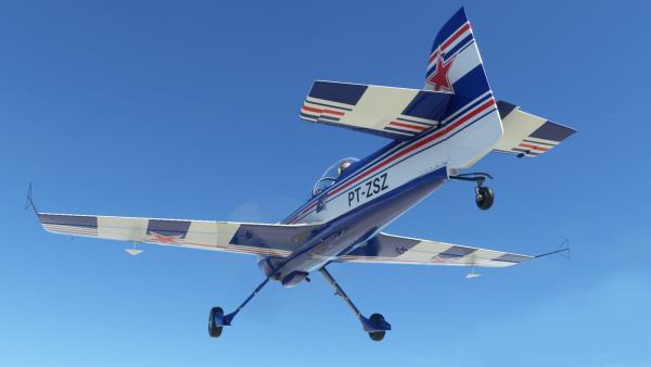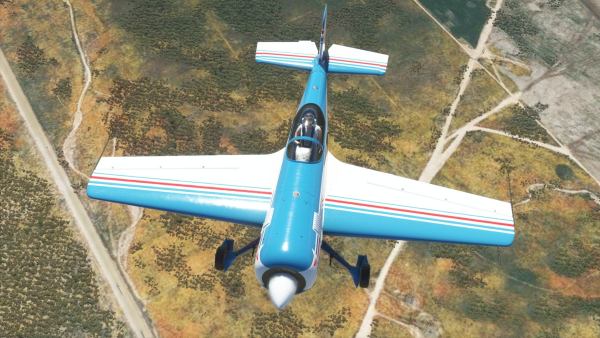 While we think the plane is fun to fly, and you should be able to pull most aerobatic maneuvres, the flick/snap roll behavior is not great and it is difficult to control it precisely. Also, the simulator seems to overestimate the energy loss during vertical maneuvres, so we “pumped” the engine and prop performance a little to have achieve speeds closer to the real aircraft during some maneuvers.