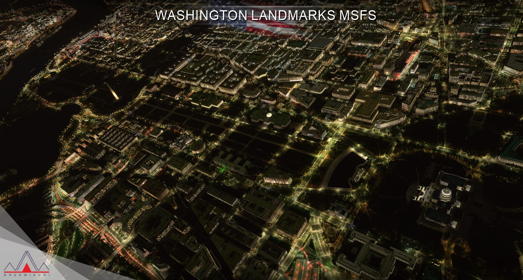 Washington Landmarks MSFS is a package of Washington D.C. landmarks. It includes roughly 1500 custom-made buildings and other points of interest like monuments, bridges, trains, stadiums. Explore custom-modeled areas such as The Mall, West End, East End, Waterfront, U.S.G., Crystal City, and Rosslyn – all in full PBR and with epic night textures. Have you ever been to the Oval Office in the White House? This is your chance! Additionally, an optional enhancement pack for 4 airports around Washington is provided (KADW, KCGS, KVKX, W32) as well as a dozen of landable helipads.