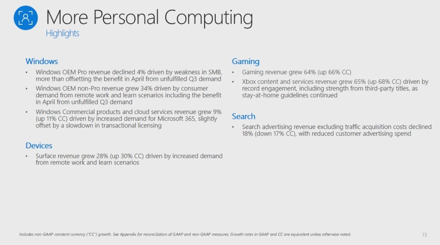 Xbox Content and services revenue grew a whopping 65% year-on-year ($1.2 billion), with a 64% growth ($1.3 billion) in overall gaming revenue driving a 14% revenue increase for the whole More Personal Computing business.