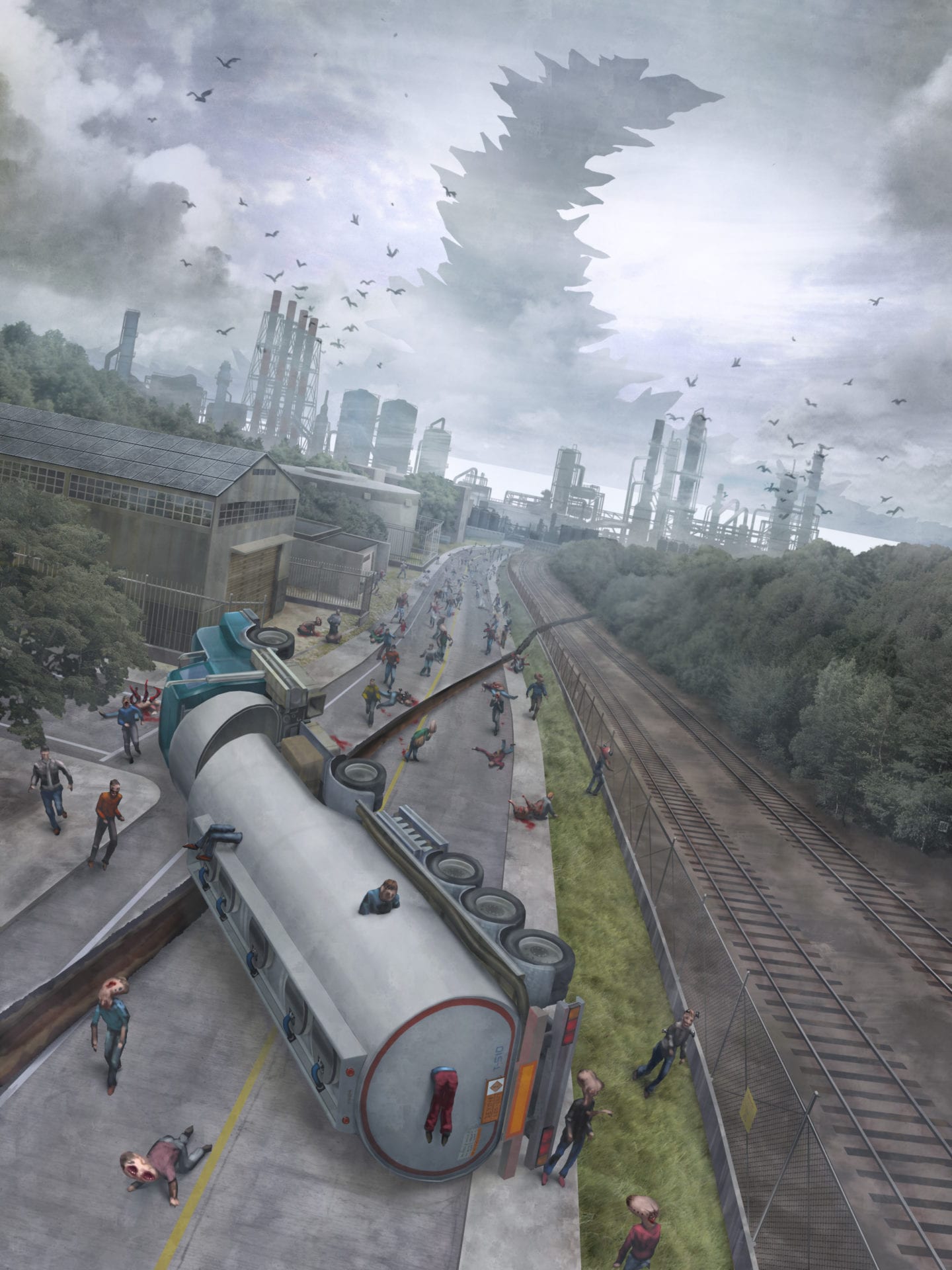 The color of the wall was picked to be the same as that of the clouds of the image board portraying the industrial area (which you can also see in the gallery). The angle is still oblique, but inverted.
