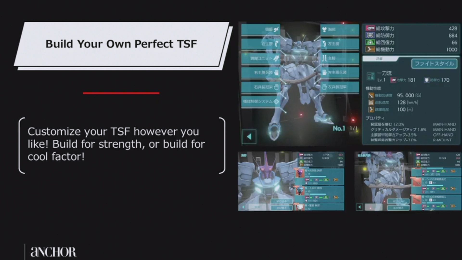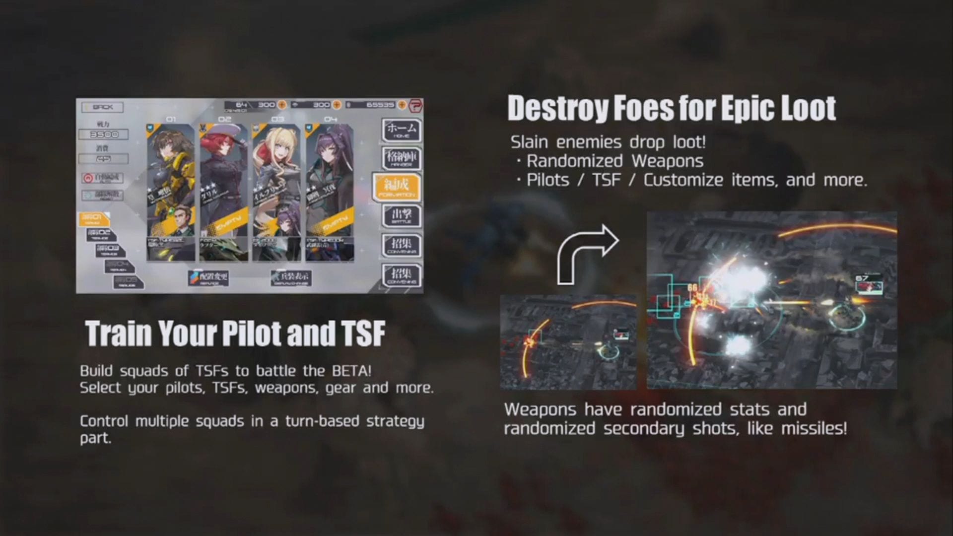 Loot with randomized properties will be dropped during battles, letting you upgrade and customize your TSF however you want.