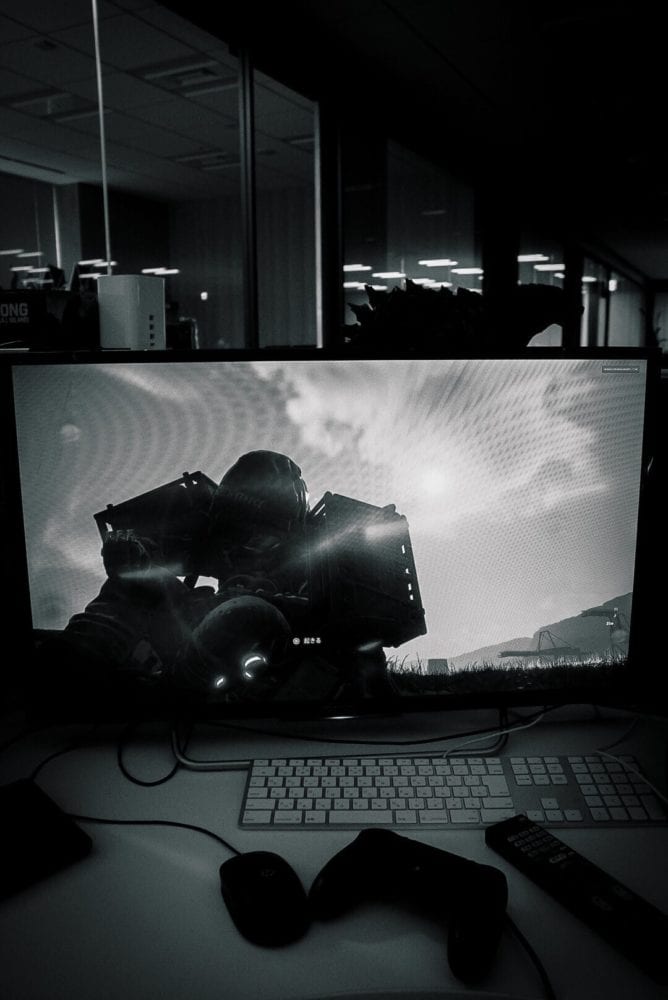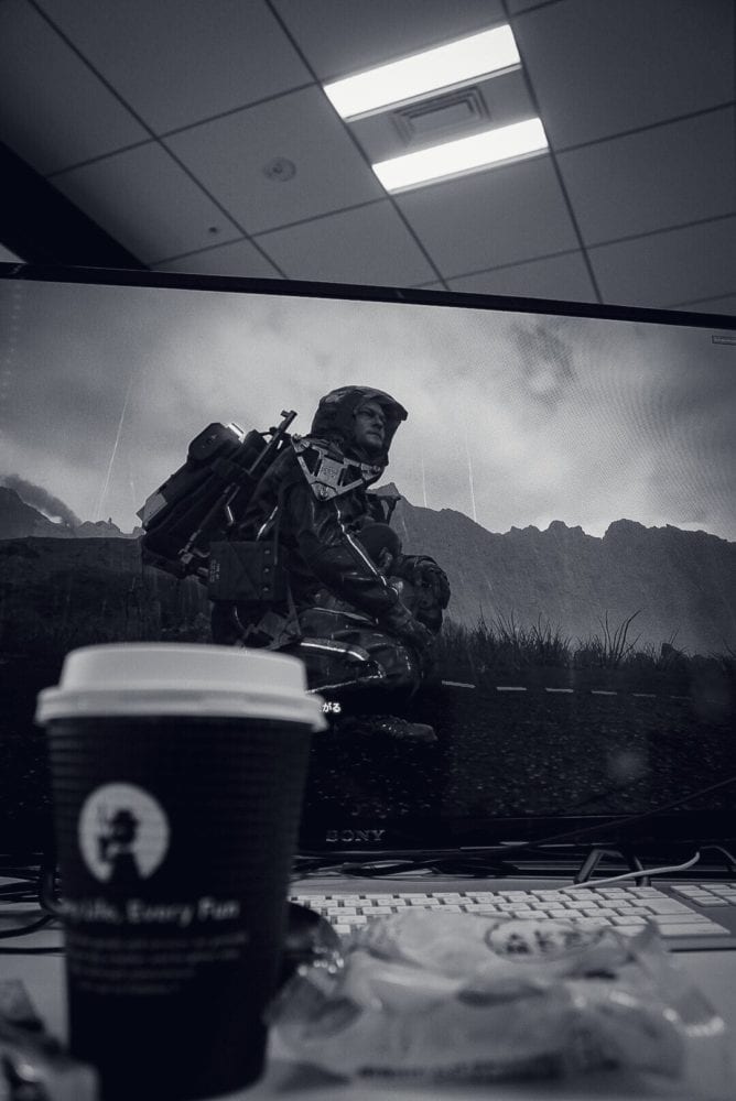 Kojima-san has been working on testing his game, and it has become pretty much a habit to take pictures of the screen while taking breaks.