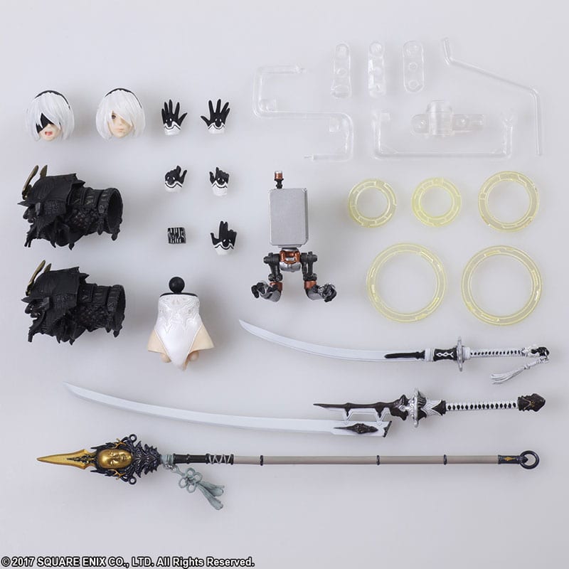 About the accessories, 4 types of mountable weapons including Virtuous Contract, Virtuous Treaty, Cruel Arrogance, and Cruel Lament, 3 types of face parts, 7 types of hand parts, an articulated Pod, the Black Box, and a body part which can recreate self-destruction mode are included. You can have 2B to recreate various scenes in the game.
