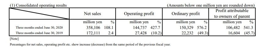 IP related income reached 13.2 billion yen (32.7% increase on a year-on-year basis).Total sales reached 358.1 billion yen, with overseas sales of 273.0 billion yen accounting for 76.3% of the total. Operating profit came to 144.7 billion yen, ordinary profit was 150.3 billion yen, and net profit attributable to owners of parent totaled 106.4 billion yen for this quarter.