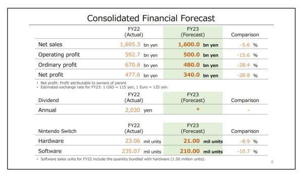 The consolidated financial forecast for the full fiscal year remained the same, with Nintendo expecting year-on-year drops in both net sales and operating profit.