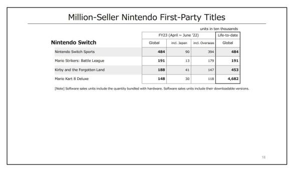 Nintendo Switch Sports has shipped 4,840,000 units, Mario Strikers: Battle League has shipped 1,910,000 units, Kirby and the Forgotten Land shipped 4,530,000 units, and Mario Kart 8 Deluxe has reached 46,820,000 units shipped.