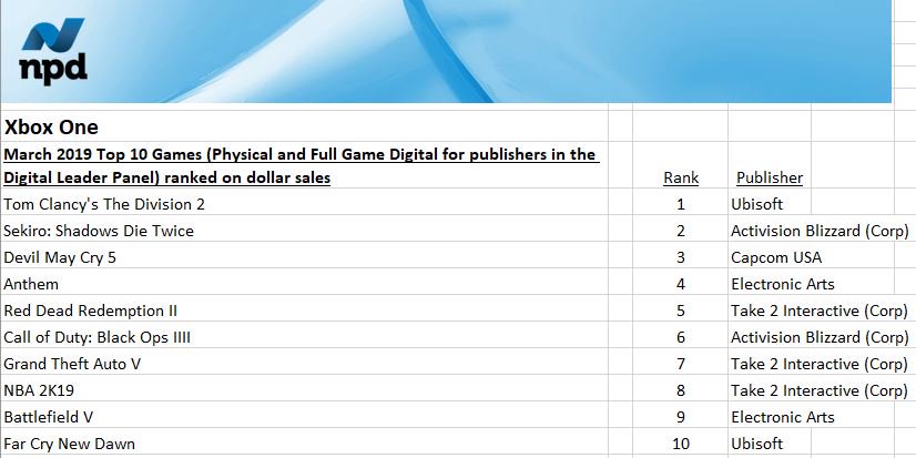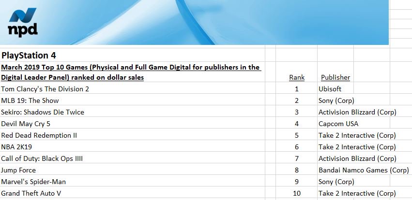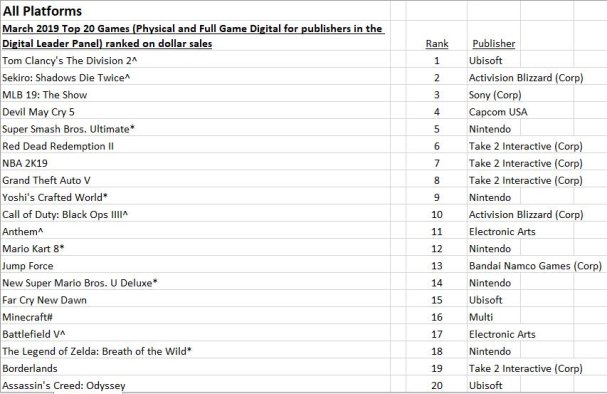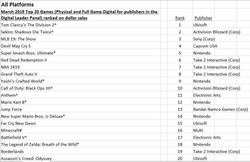 Devil May Cry 5 ranked fourth, and its launch month sales are he second-best for the franchise, behind Devil May Cry 4.