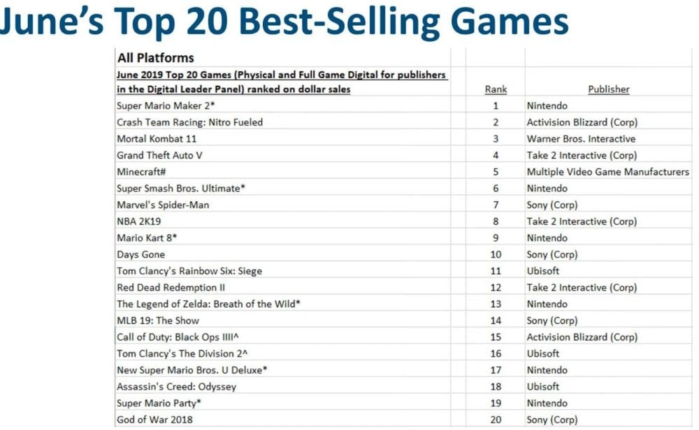 Super Mario Maker 2 is the best-selling game for June, followed by Crash Team Racing: Nitro-Fueled. Super Mario Maker 2 set a new launch record for the Mario Maker franchise, and the same can be said for Crash related to its own series. It even beat Crash Bandicoot: N. Sane Trilogy’s debut.