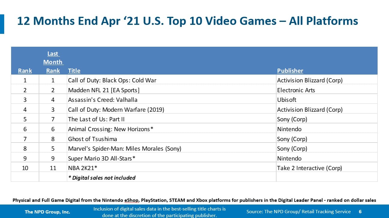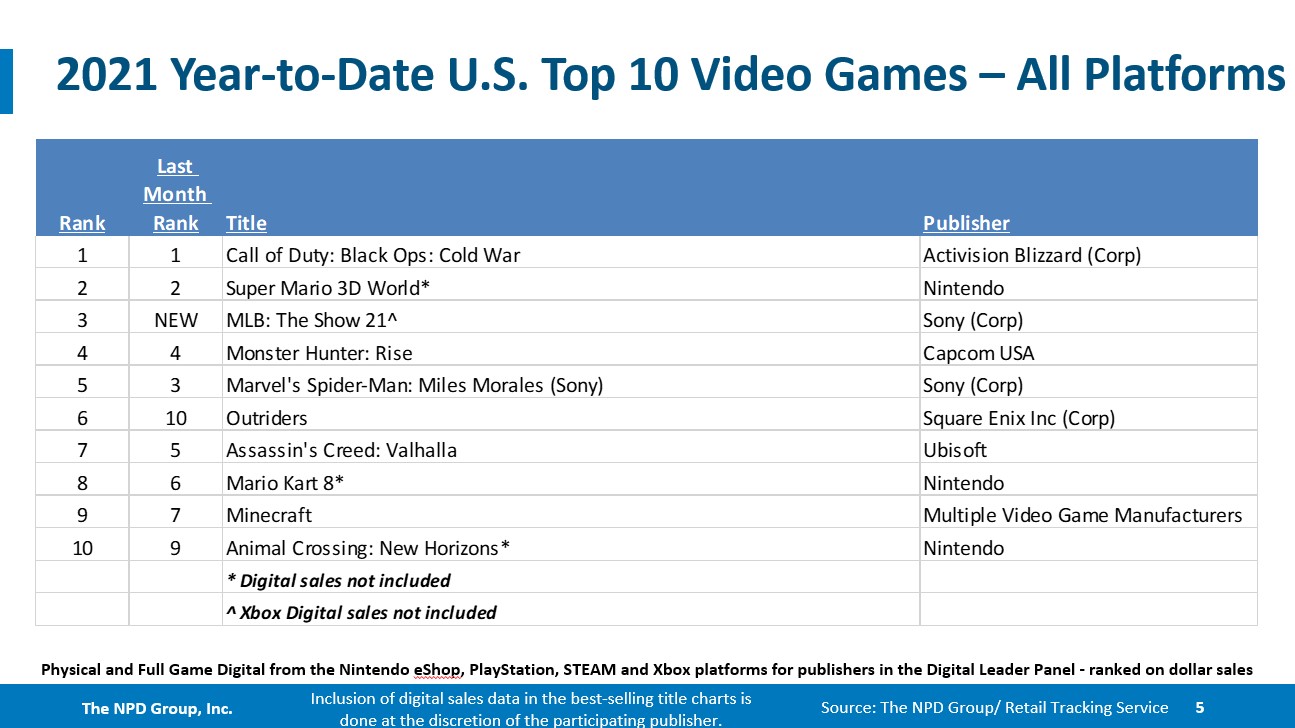 • “April 2021 spending on video game accessories declined 23% versus a year ago, to $168 million. Year-to-date accessory sales reached $885 million, an increase of 22% when compared to the same period in 2020.”