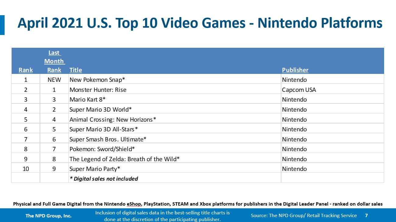 • “New Pokémon Snap was the 3rd best-selling game of April 2021 and was the month’s best-selling game on Nintendo platforms. Launch month physical sales of New Pokémon Snap more than doubled those of Pokémon Snap, which debuted in the July 1999 tracking month.”