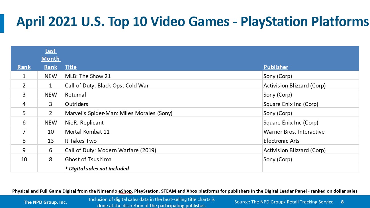 - “MLB The Show 21 was the best-selling game of the month on PlayStation platforms, and ranked 2nd on Xbox (note that digital sales on Xbox platforms are not included in the rankings).”