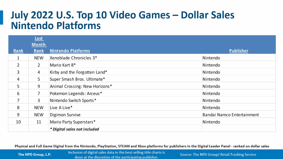 “Xenoblade Chronicles 3 debuted as the #4 best-selling game of July despite digital sales not being included in the ranked reporting. It also ranked as the best-selling game of July on Nintendo Switch.“