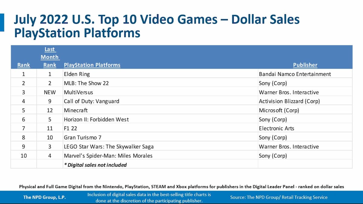 Market research firm The NPD Group published its report tracking video game spending across the U.S in July of 2022, and it was Warner Bros. MultiVersus that came away as a big winner on the software front. Hardware, meanwhile, was dominated by the PS5 with respect to dollar sales, and the Nintendo Switch once again sold the most total number of units.