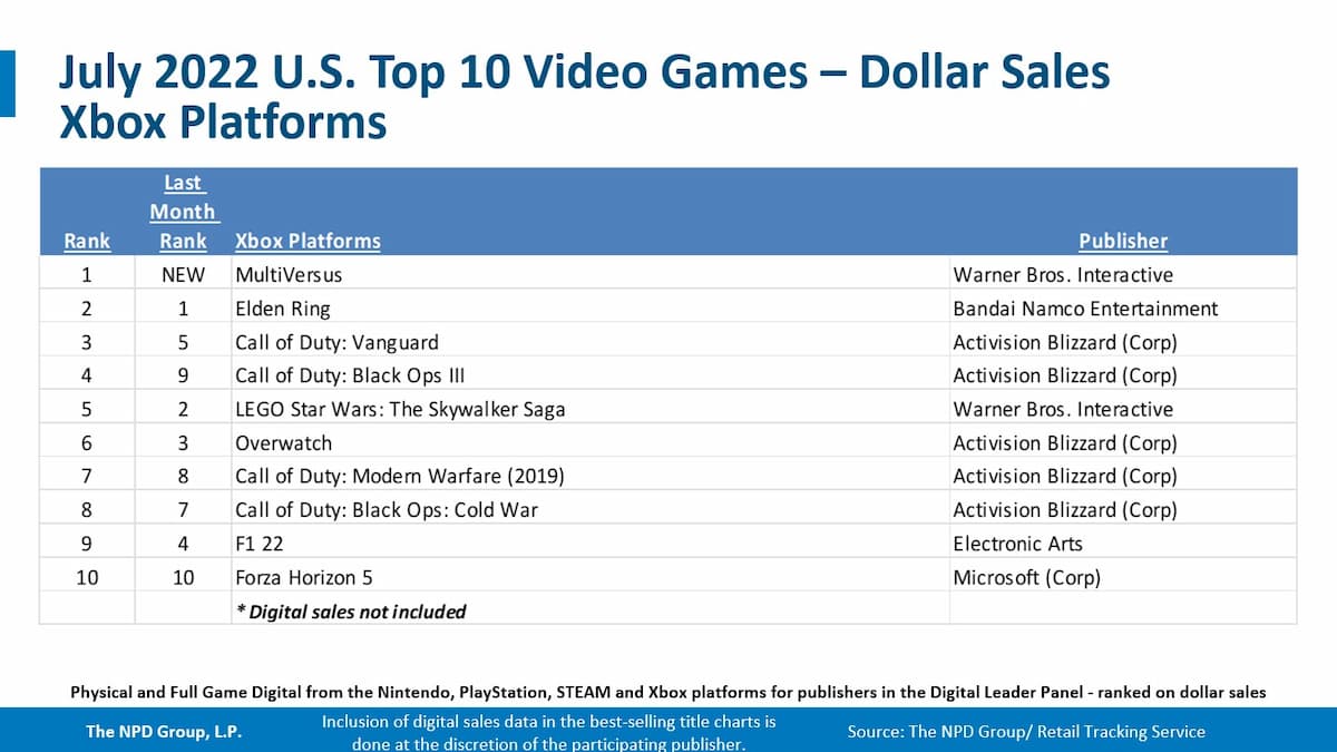 “MultiVersus was July’s best-selling video game, driven by sales of MultiVersus Founder’s Packs. Warner Bros. published two of the top 3 best-selling games of July, with LEGO Star Wars: The Skywalker Saga also ranking 3rd.“