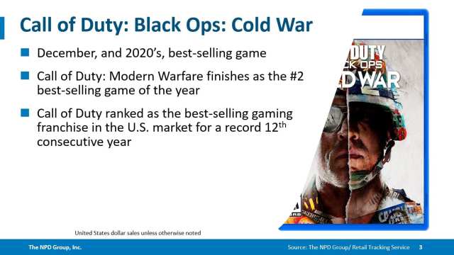 “Call of Duty: Black Ops: Cold War was the best-selling game of both December as well as 2020, while Call of Duty: Modern Warfare was 2020’s 2nd best-seller. Call of Duty ranked as the best-selling gaming franchise in the U.S. market for a record 12th consecutive year.”
