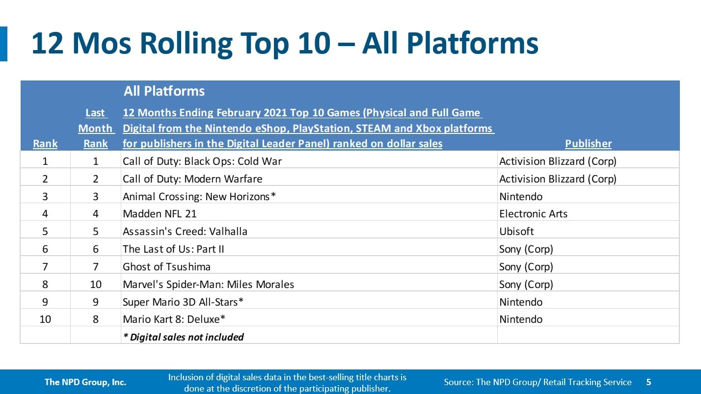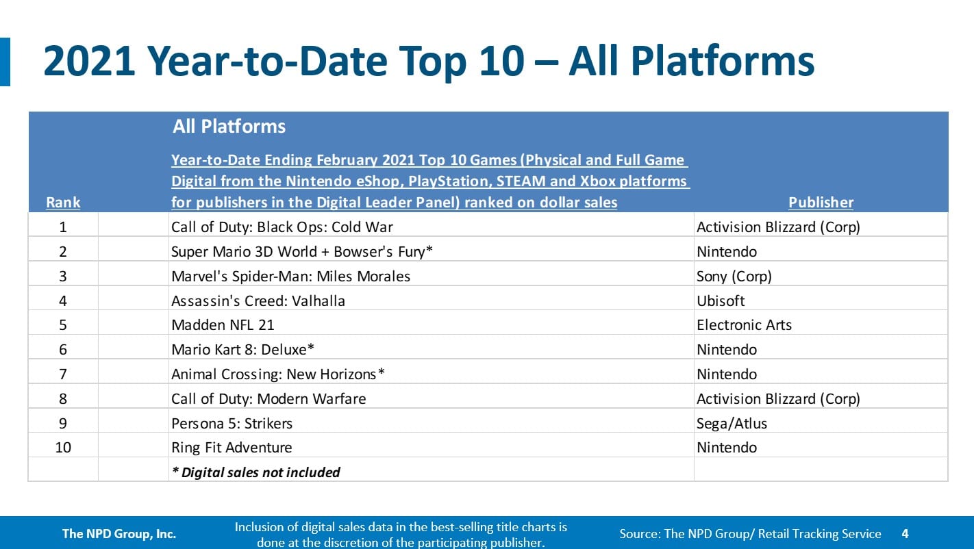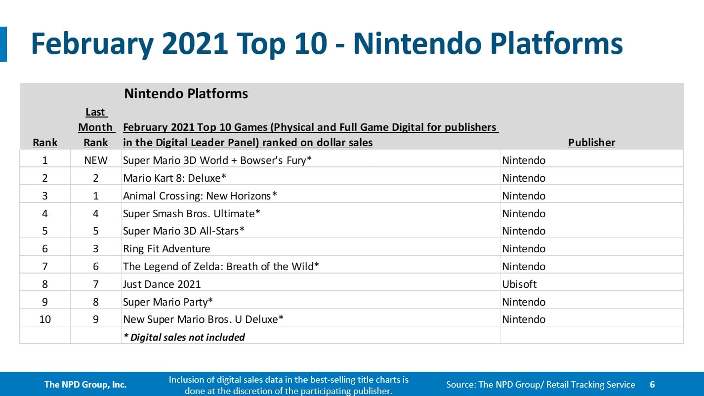 - Super Mario 3D World + Bowser’s Fury debuts as the best-selling game of February. The title also ranks as the 2nd best-selling game of 2021 year-to-date, despite the lack of digital sales tracking for Nintendo published titles.