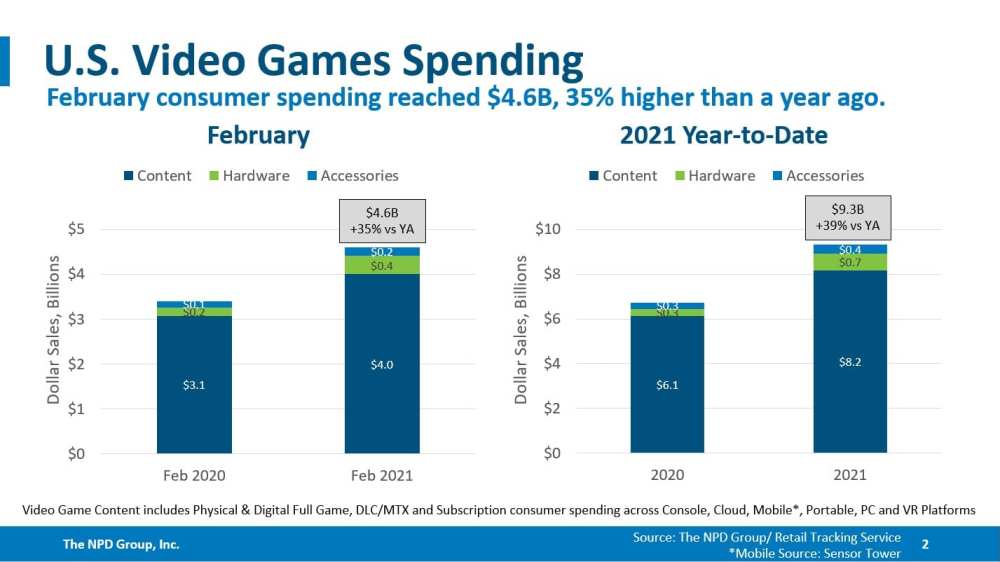 The NPD Group’s monthly report on spending across the US video game market is out for February, and yet again new records have been set. Specifically, the $4.5 billion total is 35 percent higher year-on-year, with year-to-date spending already 39 percent higher than in 2020 at $9.3 billion.
