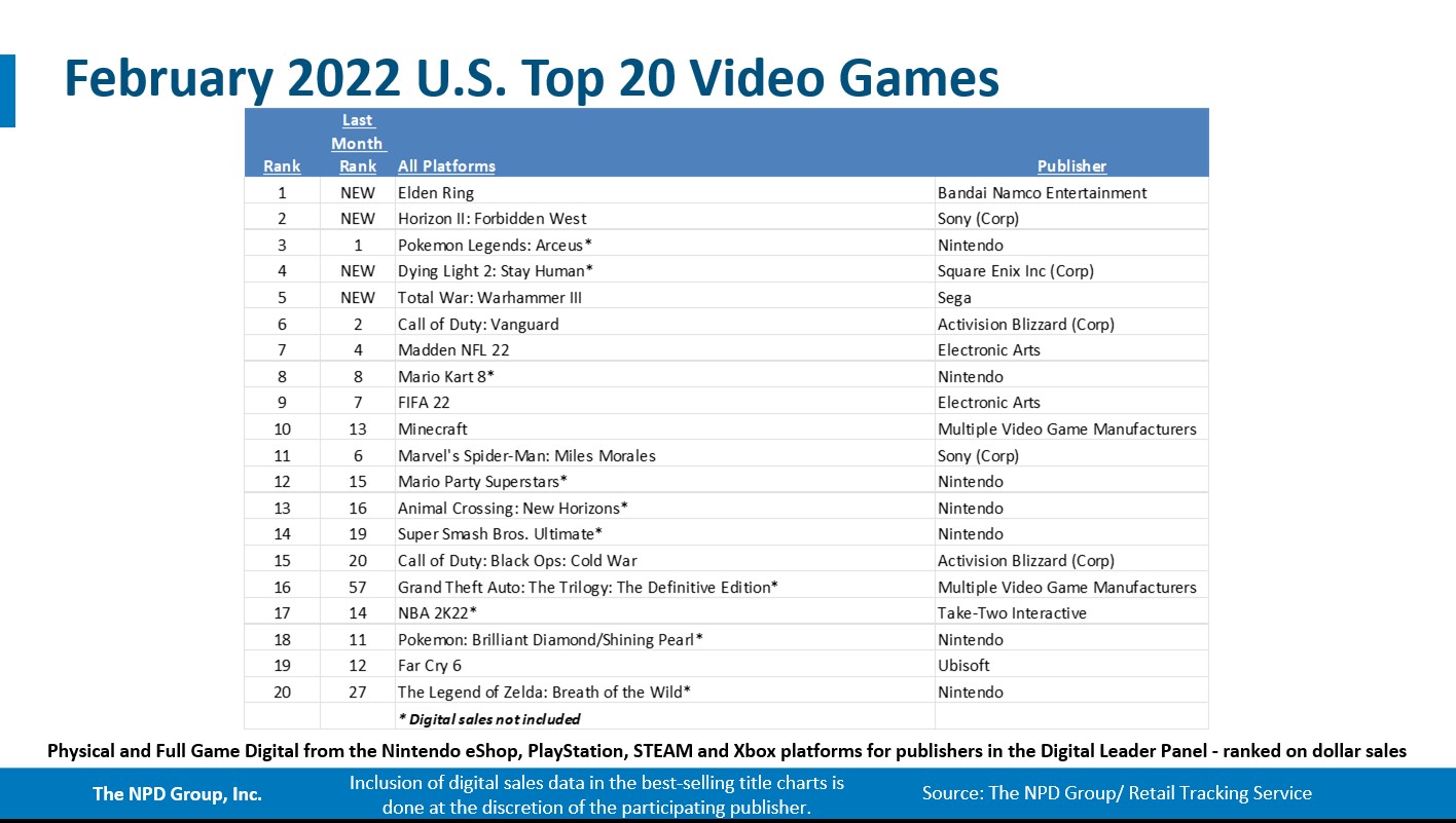 In addition to its impressive critical reception, Elden Ring has enjoyed a hugely positive launch according to The NPD Group, as the details of the company’s February report tracking U.S video game spending have been shared today by executive director & video game industry advisor Matt Piscatella. As usual, in addition to software numbers, we also get a look at the overall trends shaping the market in 2022, including hardware and accessory performance.