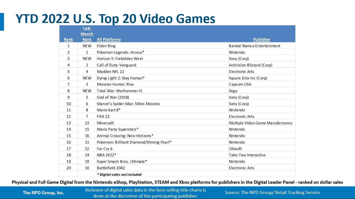 “Elden Ring debuted as both the best-selling game of February 2022 as well as 2022 YTD. Launch month sales of Elden Ring were the 2nd highest for any tracked title released in the past 12 months, trailing only Call of Duty: Vanguard, released in Nov 2021.”