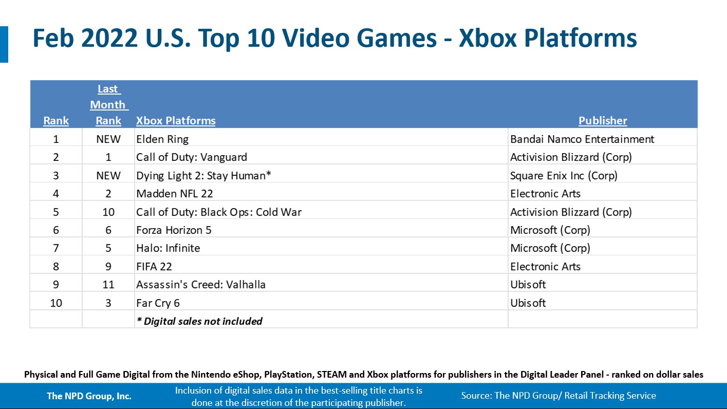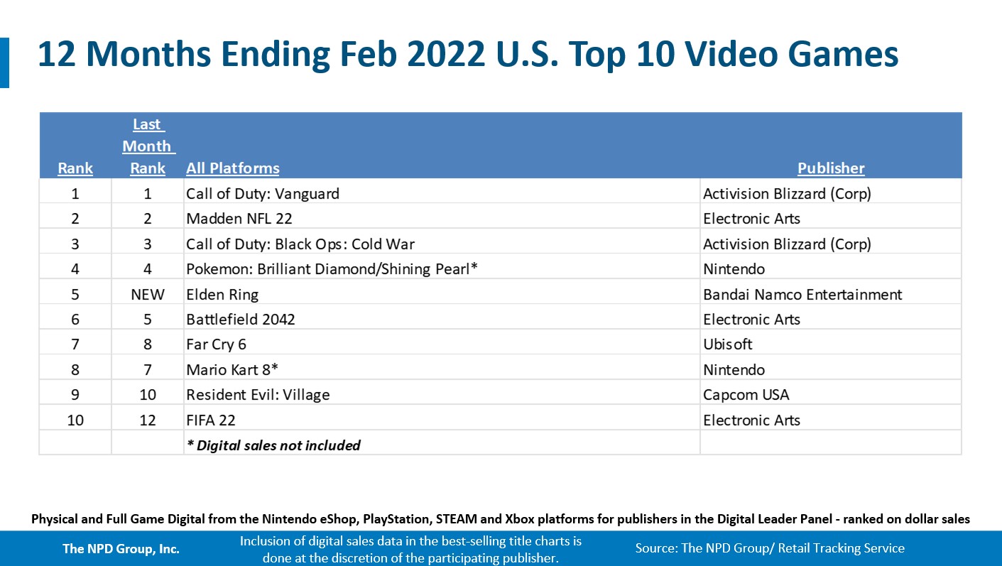 After 1 month in market, Elden Ring ranked as the 5th best-selling game of the 12 month period ending February 2022. Elden Ring ranked 1st on Steam and Xbox platforms in February, while placing 2nd on PlayStation.