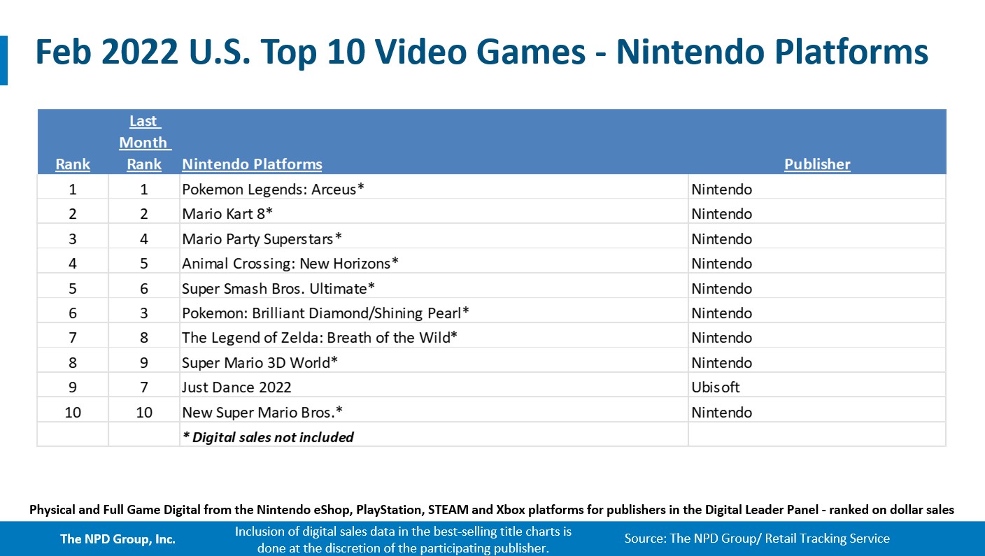 Switch was the best-selling hardware platform of February 2022 in both units and dollars. Xbox Series ranked 2nd across both measures.