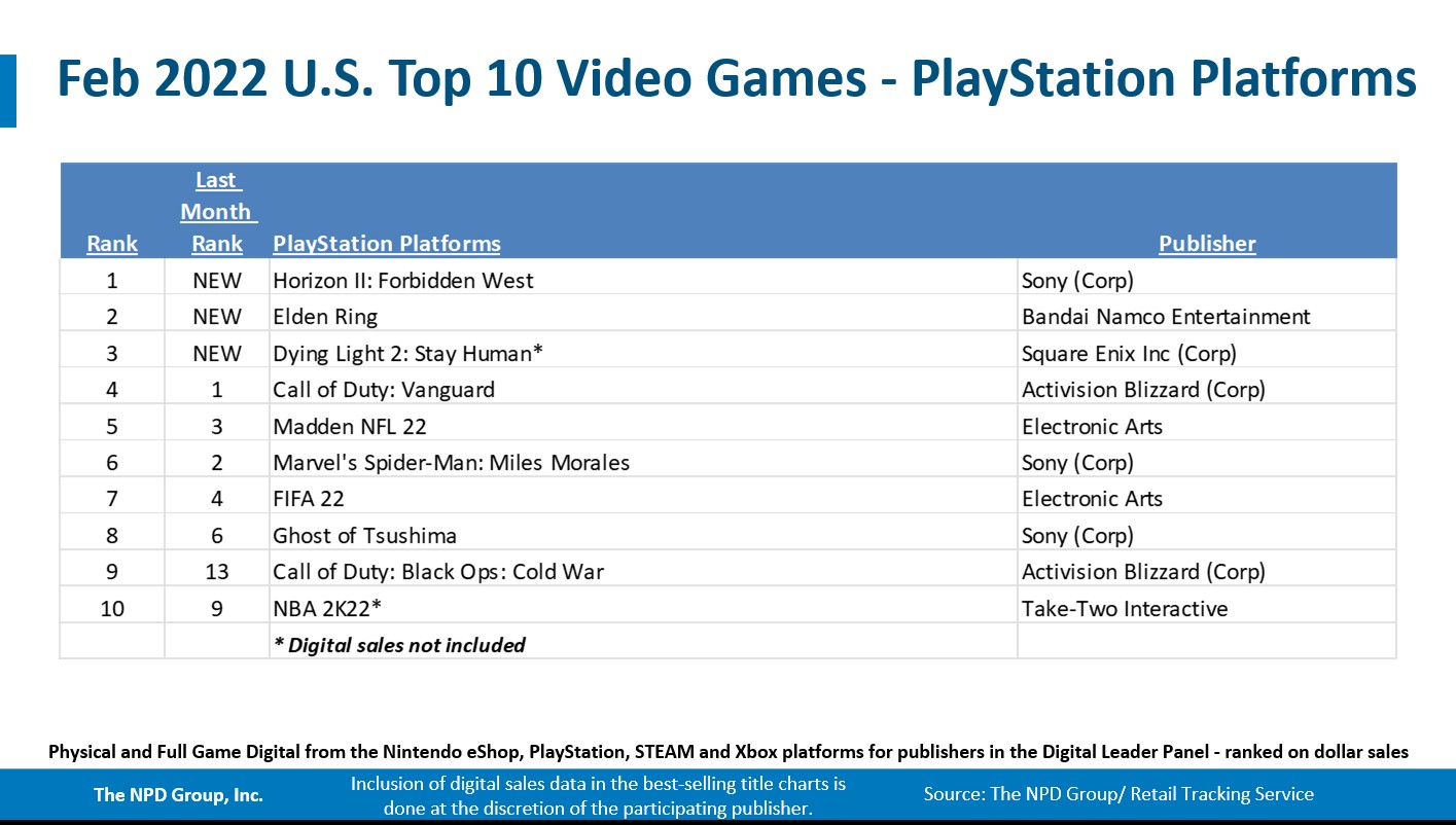 “Horizon II: Forbidden West was the 2nd best-selling game of February 2022, while also ranking 1st on PlayStation platforms. Dollar sales of the PlayStation 5 version of Horizon II: Forbidden West set a new launch month record for the PlayStation 5 platform.”