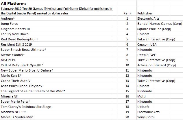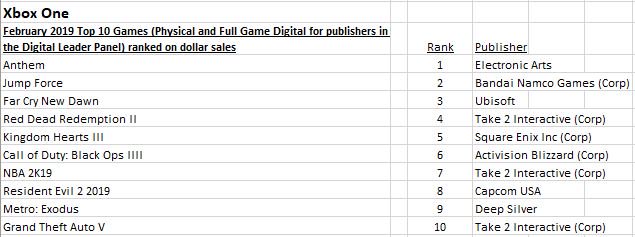 The best selling game for February is Anthem, followed by Jump Force and Kingdom Hearts III. You can see the full top-twenty in the gallery at the bottom of the post alongside the best-selling games on PS4, Xbox One, Switch, and 3DS.