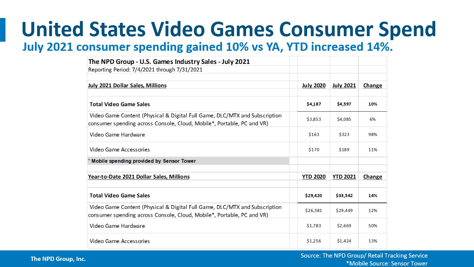 - July 2021 consumer spending across video game hardware, content and accessories increased 10% when compared to a year ago, reaching a July record $4.6B. Year-to-date spending totaled $33.5B, a 14% increase when compared to the same period in 2020.