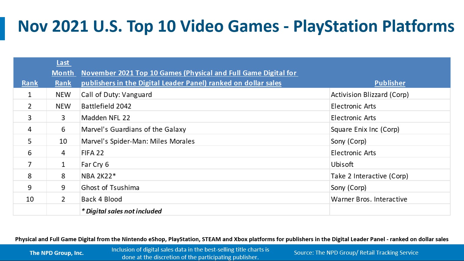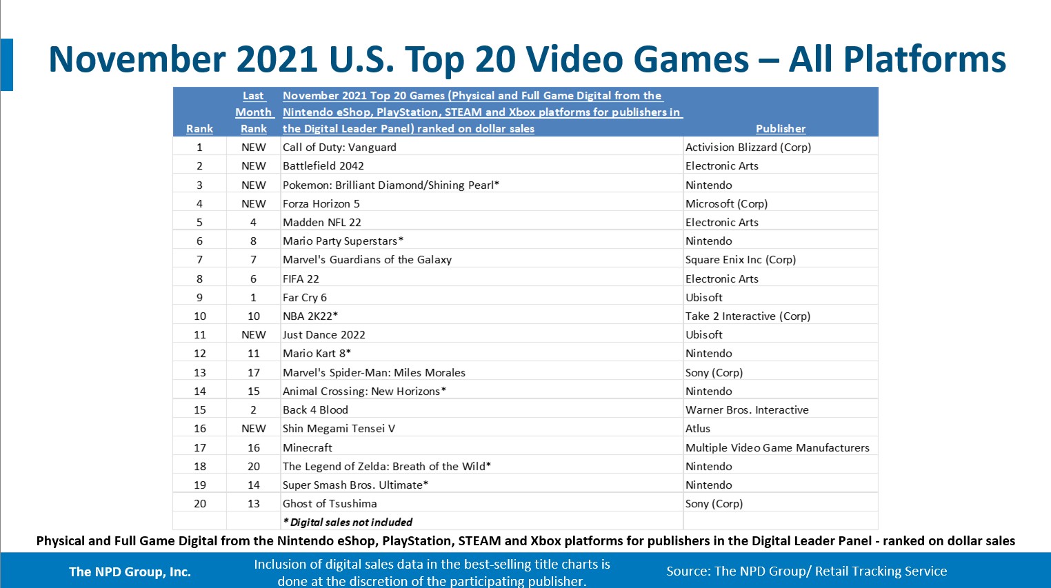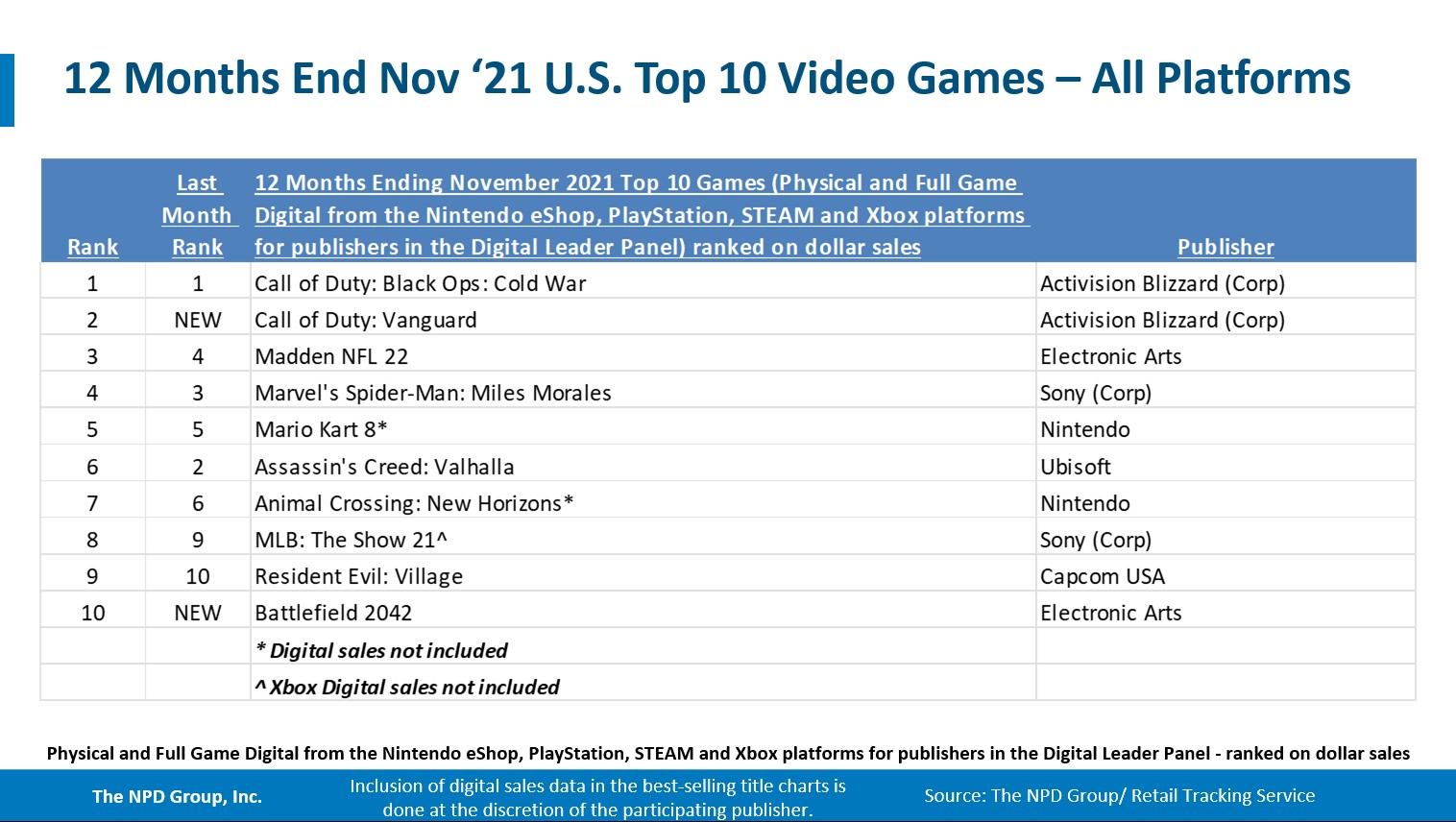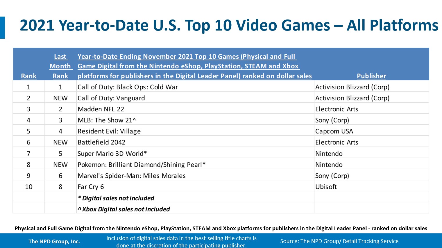- Call of Duty: Vanguard debuted as November’s best-selling game, instantly becoming the 2nd best-selling game of 2021 to date. This is the 14th consecutive year a Call of Duty game has ranked as the best-selling game of its release month.