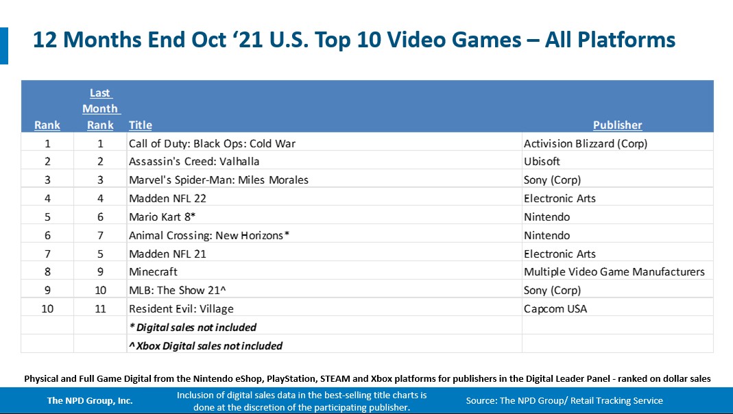 - October 2021 consumer spending across video game hardware, content and accessories grew 16% vs YA, reaching an October record $4.4 billion. Year-to-date consumer spending reached $46.7 billion, gaining 12% when compared to the same period in 2020.