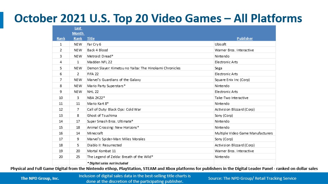 The NPD Group’s monthly report tracking spending across the US video game industry is out for October, which illustrates another month of year-on-year growth over the same period as has been the case throughout 2021. In October, sales were led by Far Cry 6, Back 4 Blood, and Metroid Dread on the software side, while Nintendo Switch and Sony’s PlayStation 5 were the month’s most lucrative hardware platforms.