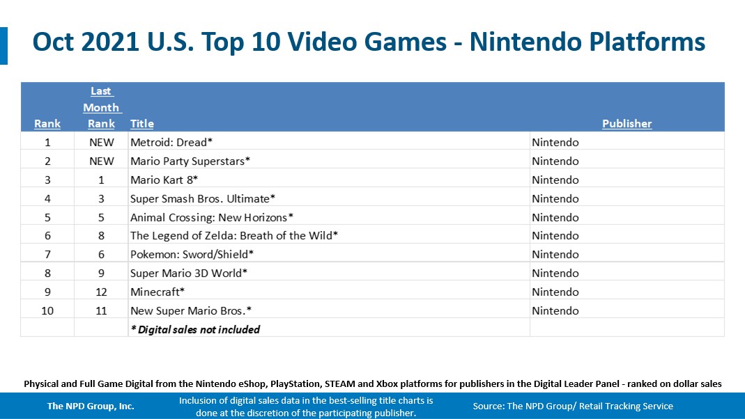 - Metroid: Dread debuted as October’s #3 best-selling game, while also ranking 1st on Switch. Metroid: Dread achieved the highest launch month sales of any Metroid franchise release in tracked history.