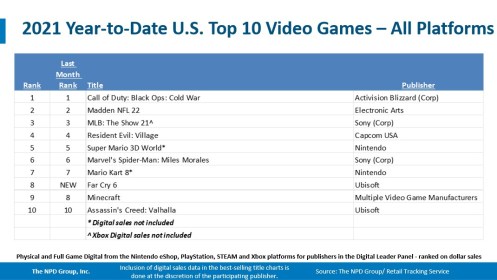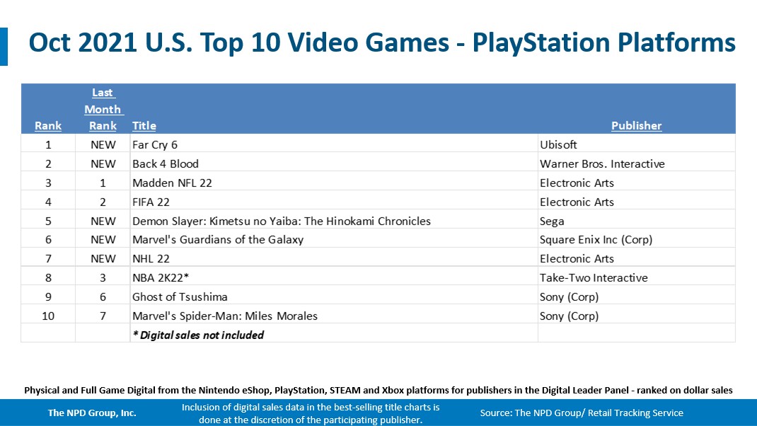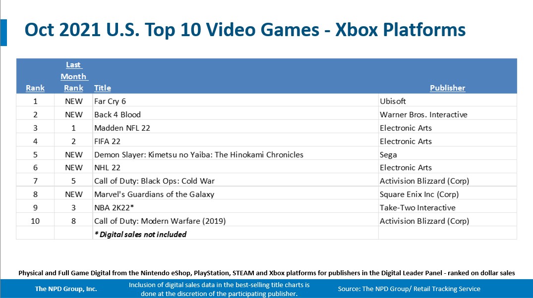 - Far Cry 6 debuted as October’s best-selling game, instantly becoming the 8th best-selling game of 2021 to date. Far Cry 6 ranked 1st on both PlayStation and Xbox platforms in October.