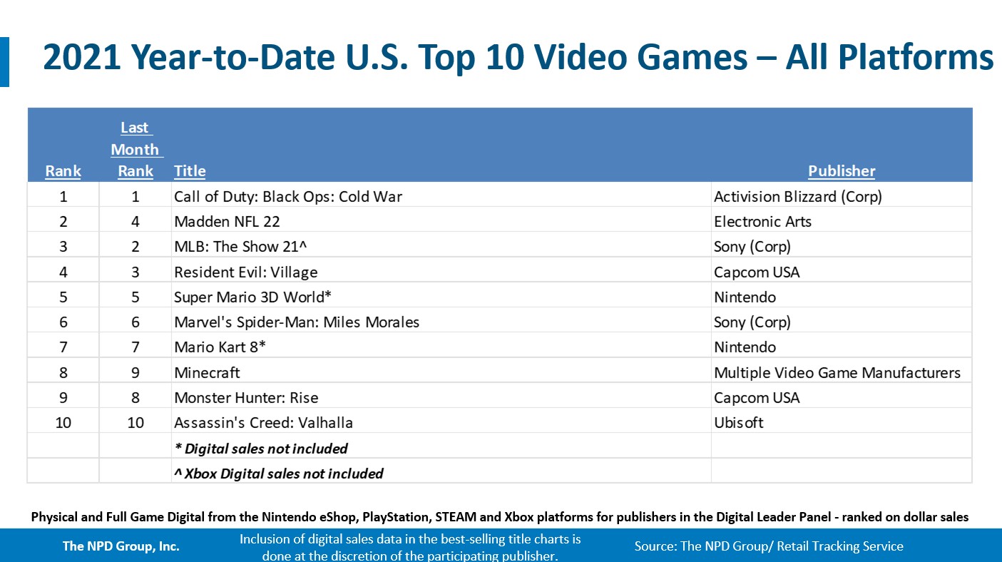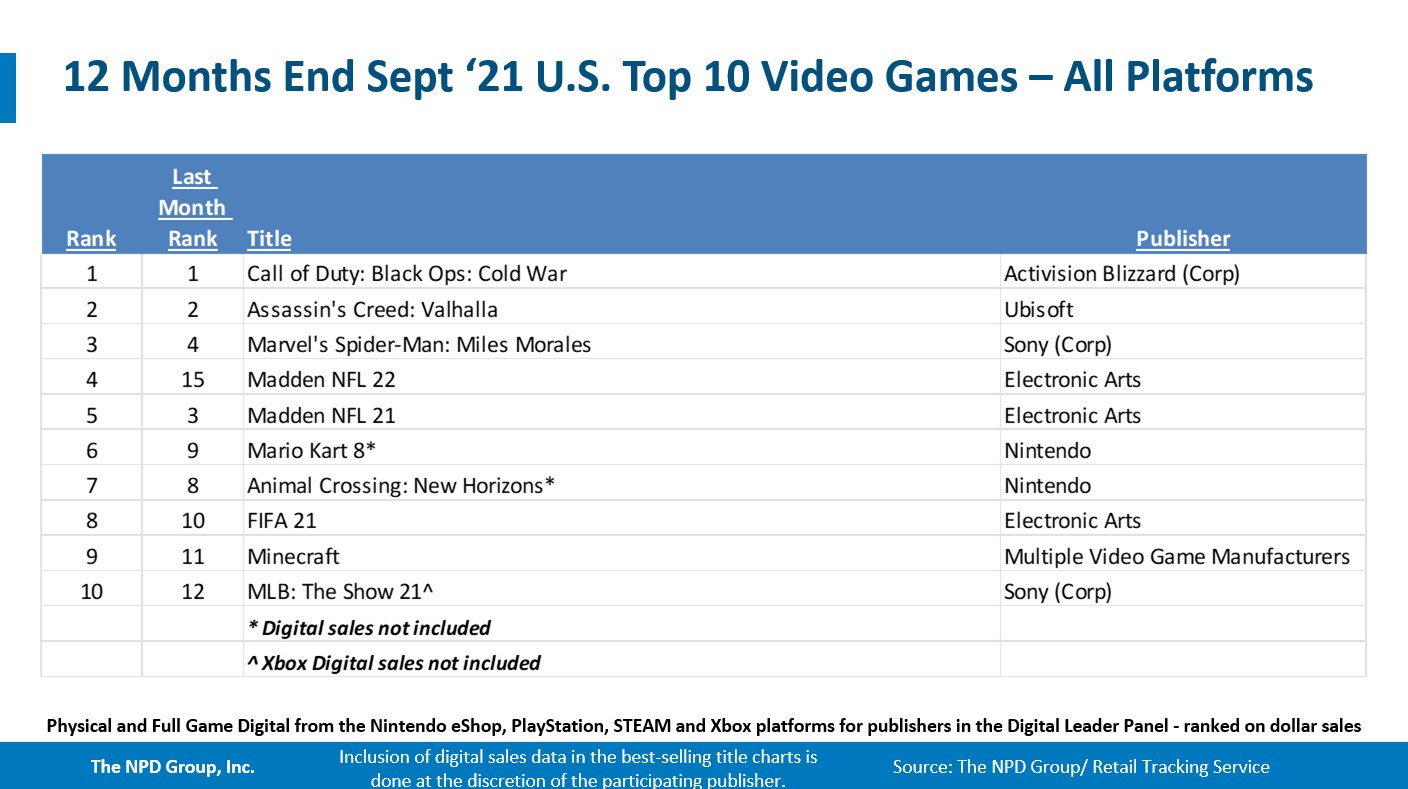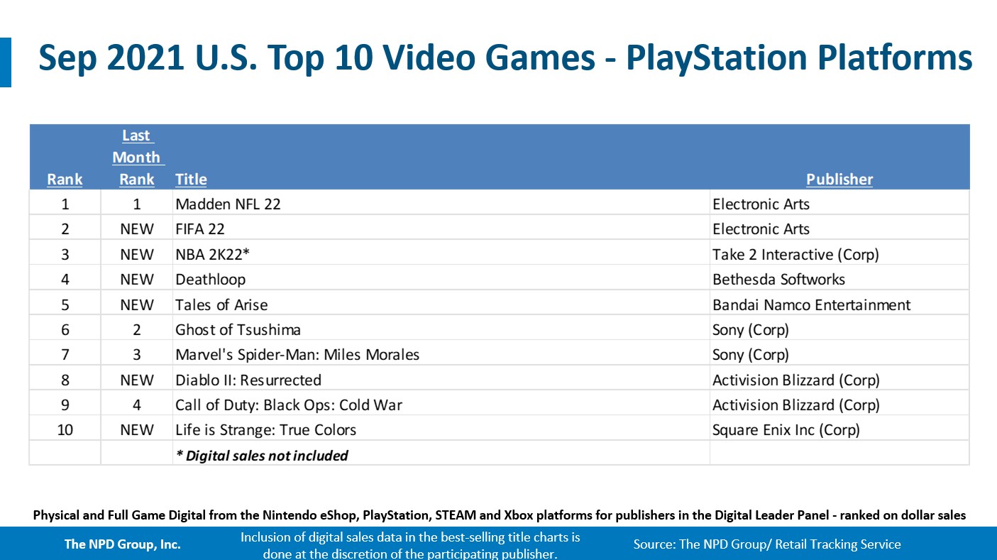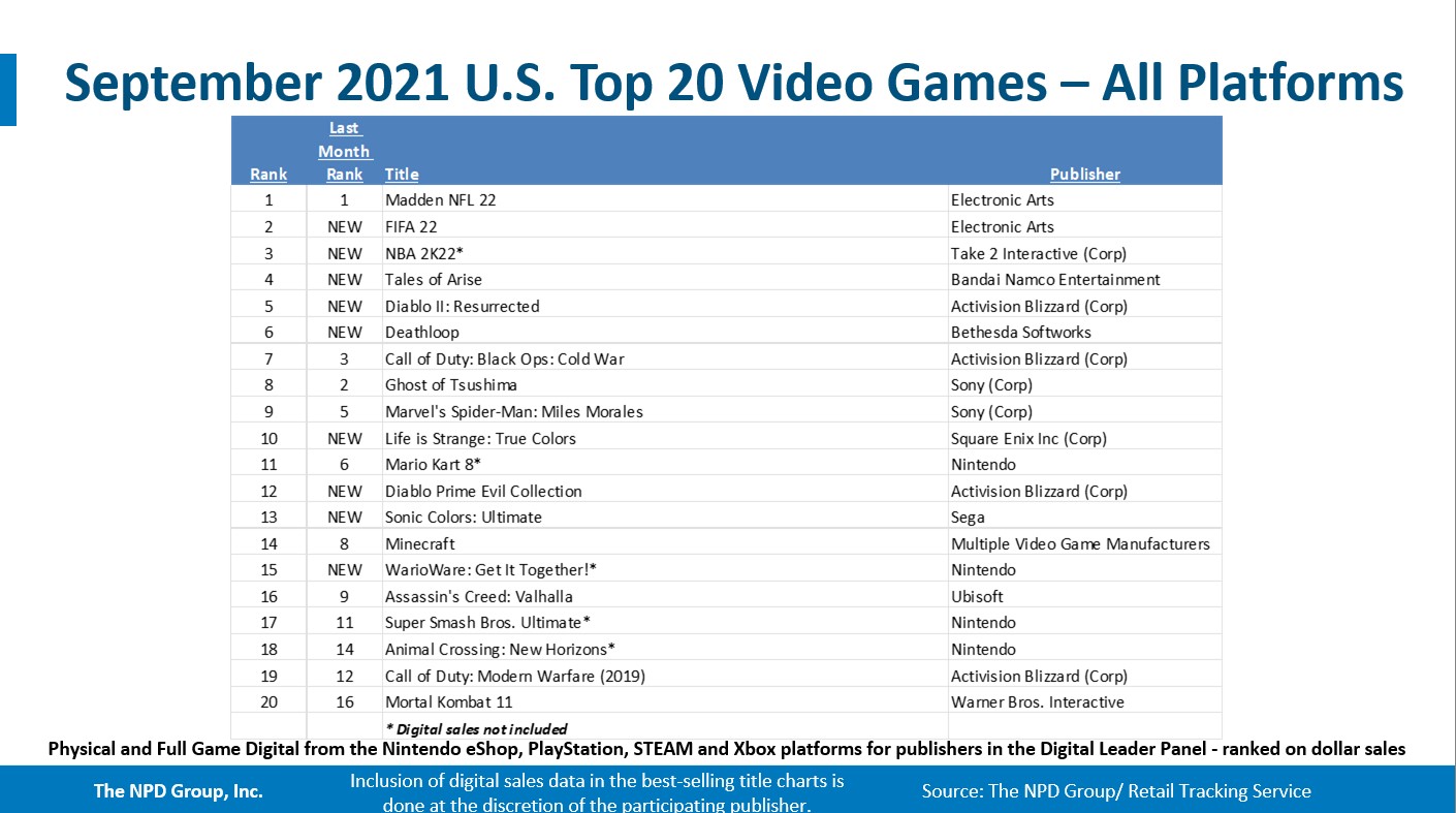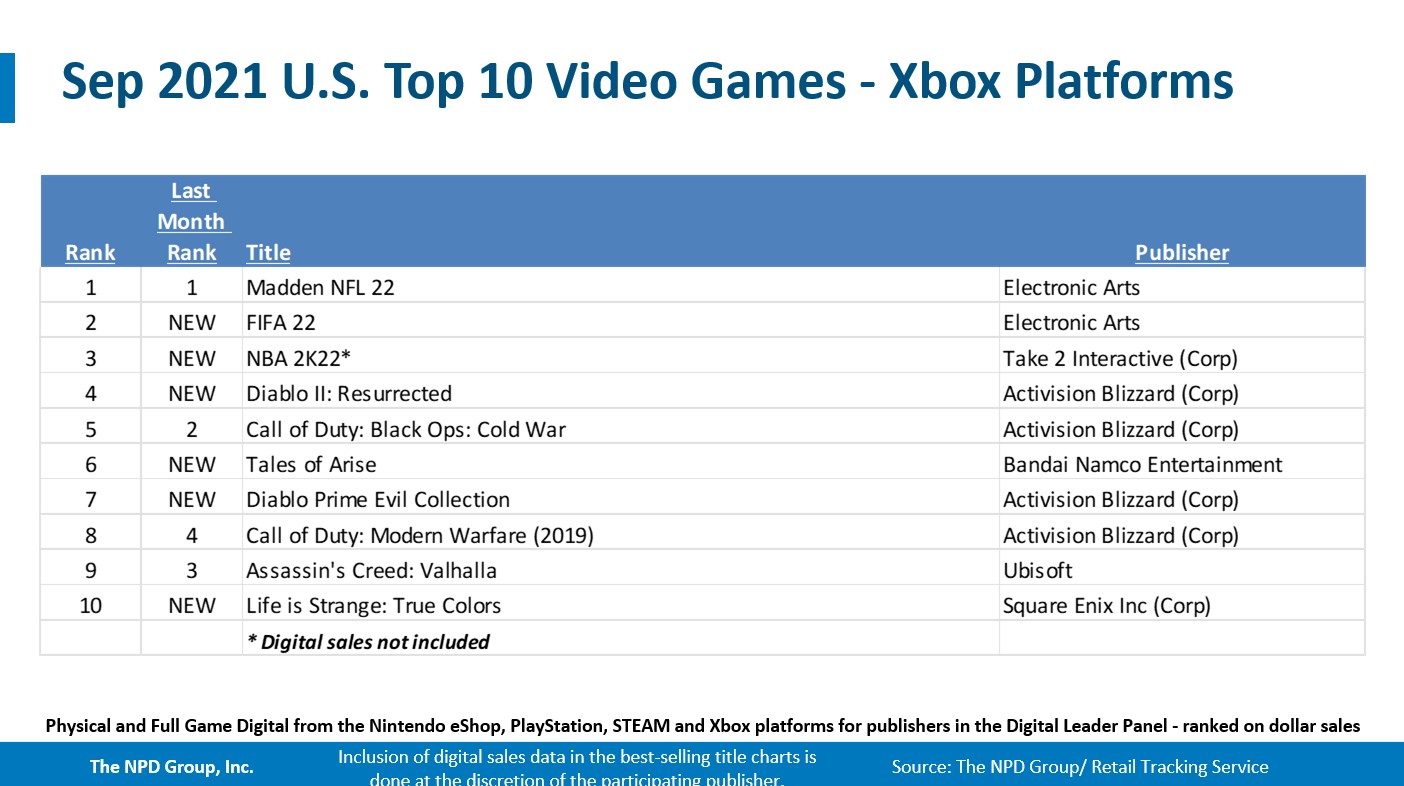 - Madden NFL 22 repeated as the best-selling game of the month. It now ranks as the #2 best-selling game of 2021 year-to-date, and is the 4th best-selling title of the 12 month period ending September 2021. Madden NFL 22 led on both PlayStation and Xbox.