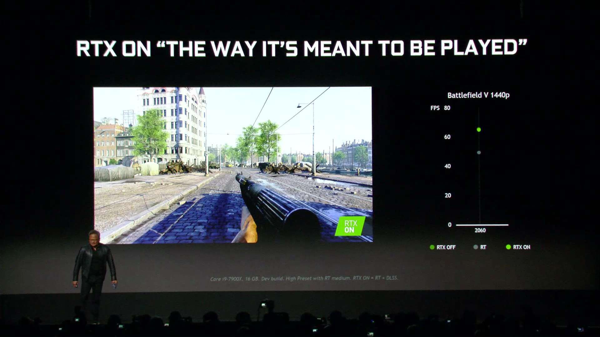 The new card is able to run Battlefield V at 1440p at over 60 FPS with RTX off, drops at about 50 with RTX on, but it jumps back up at over 60 with the help of DLSS.
