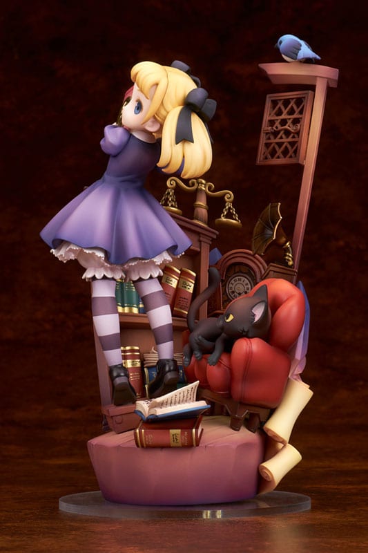 The vignette style figure uses the image of her reading in the attic.Starting with Alice clutching a book and the black cat Socrates who looks up at her from the sofa, the layout of the attic’s elements such as the bookcase, clock, sofa, and phonograph have been cleverly put together for a fun figure