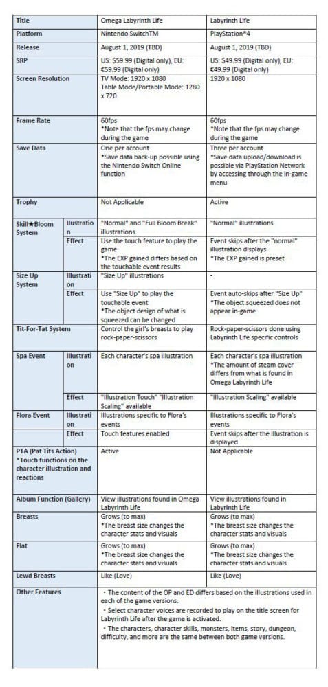 To be precise, exactly like in Japan, Omega Labyrinth Life will be released for Nintendo Switch, while the heavily censored version Labyrinth Life will launch for Ps4.