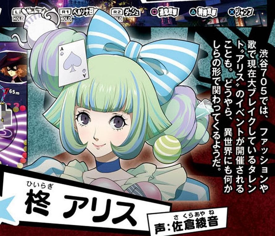 Alice Hiragi is an idol that is becoming successful in both music and fashion. She is going to participate in an event at the Shibuya 705 mall, but apparently she is involved with with the mystery the Phantom Thieves are after.
