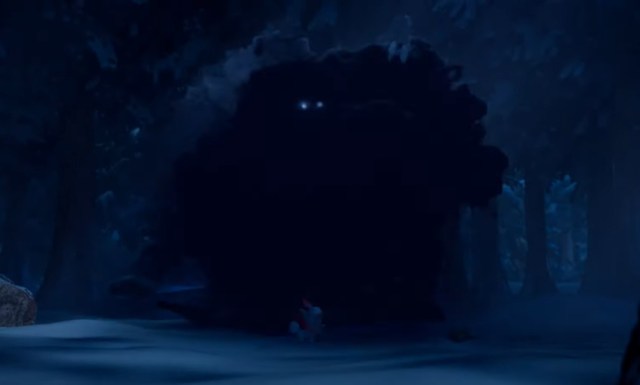 It happens so quickly, and we can’t get a great look at this shadowy figure. It’s huge with bright eyes, and it’s not like any Pokemon we’ve seen before.