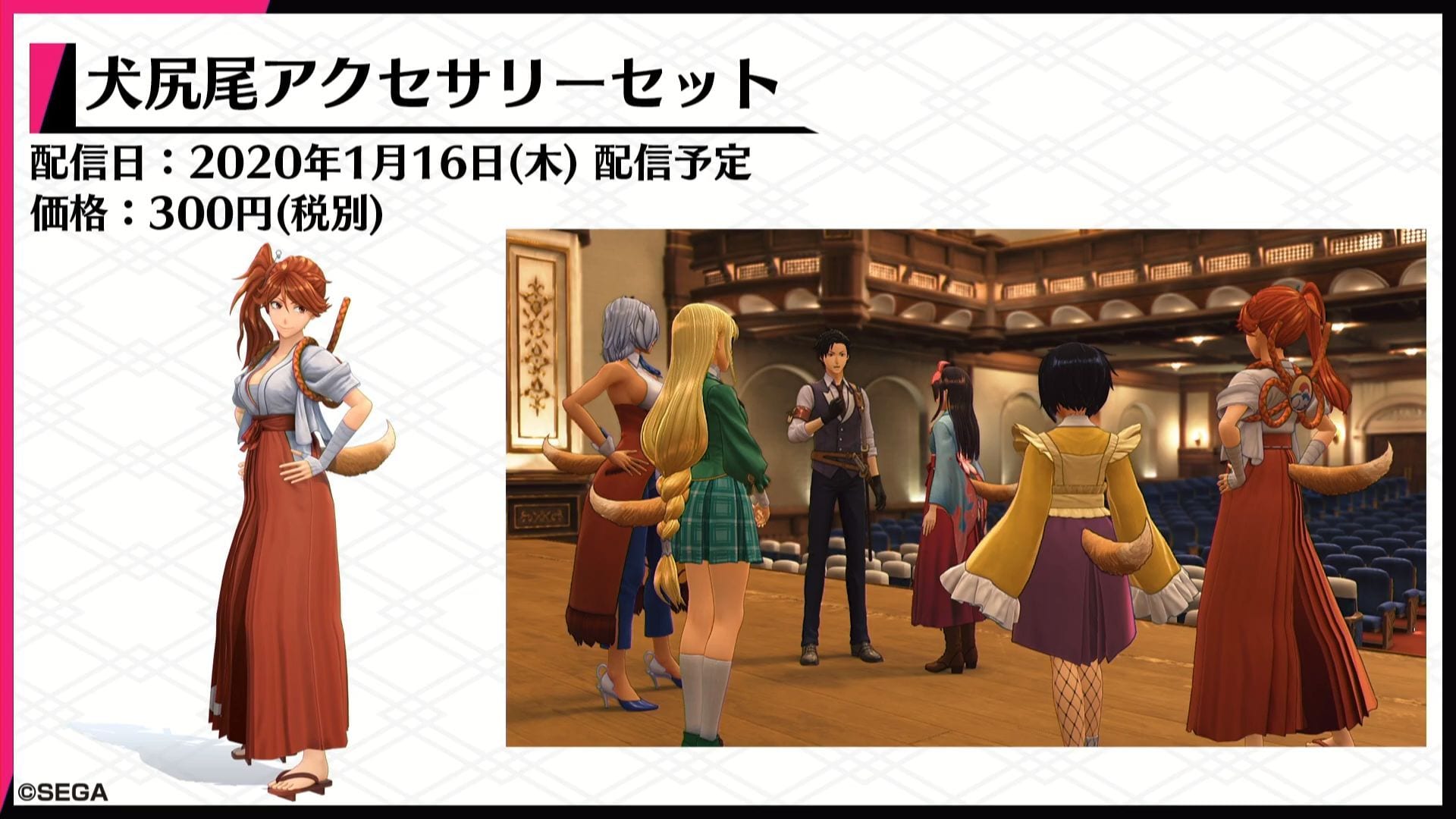 On January 16th the game will get a stage costume set for 800 yen, and a DALC with tails for 300 yen, while the inevitable swimsuits will launch on January 23 for 800 yen and cat ears (black and white) priced at 300 yen.