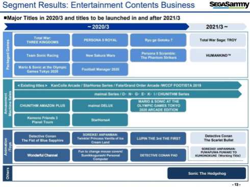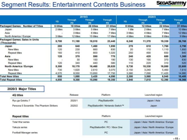 recorded in the previous fiscal year.In the packaged game software field, the Group sold repeat titles steadily though expenses increased, partly as the result of the amortization of development expenses due to multiple releases of “Total War: THREE KINGDOMS”, “Mario & Sonic at the Olympic Games Tokyo 2020″ etc. As a result, sales amounted to 26,760 thousand copies (23,440 thousand copies in the previous fiscal year).”