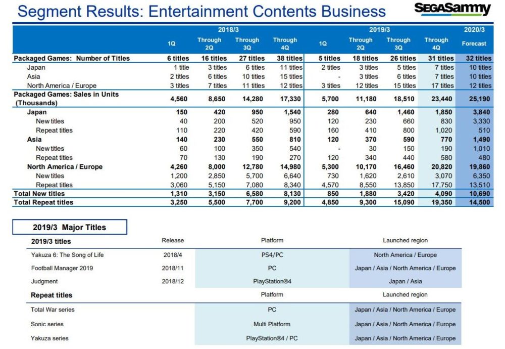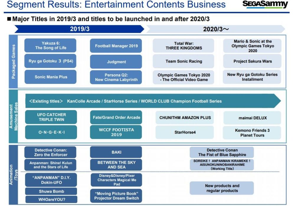 Then we can read a breakdown of the outlook for gaming for the fiscal year ending in March 2020. Interestingly, talking about packaged games (on consoles and PC excluding online-only games), the goal is to strengthen IP development for multiple platforms in all regions. Multiple new titles that capitalize on Sega’s IP will also be released, while Sega will also focus on increasing profits coming from repeat sales of existing games.
