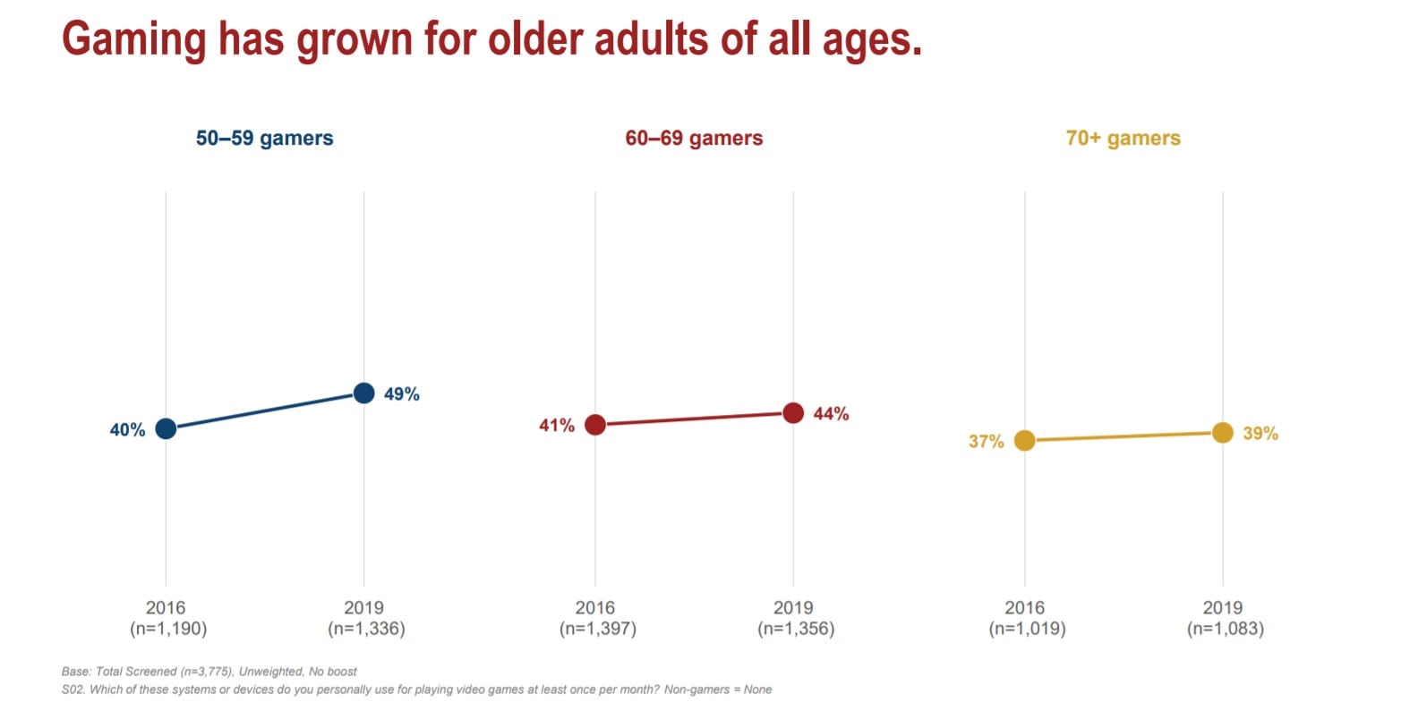 Interestingly, older players have become more willing to discover new games and teach themselves how to play, rather than relying on younger generations for instruction as has always been the stigma. Older players use internet resources such as video guides to upskill.