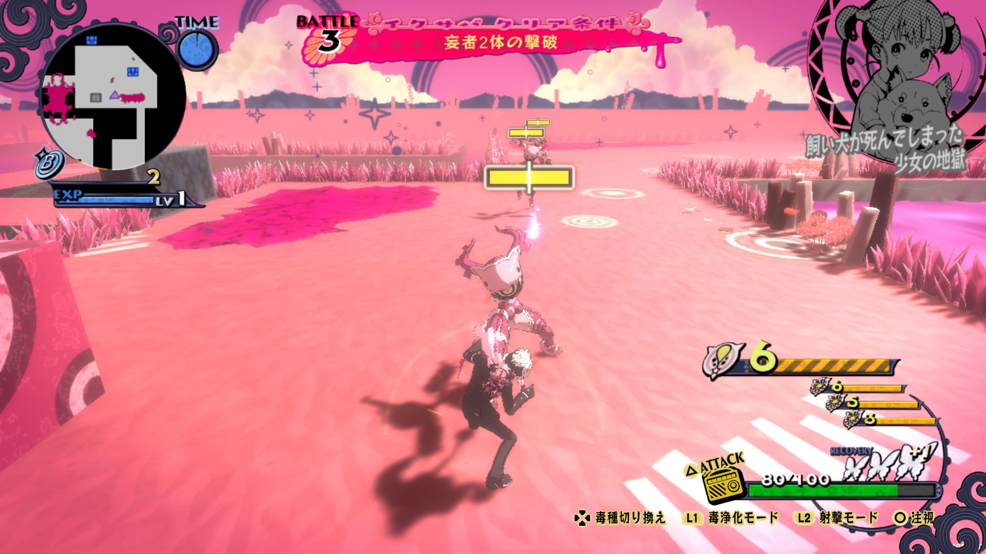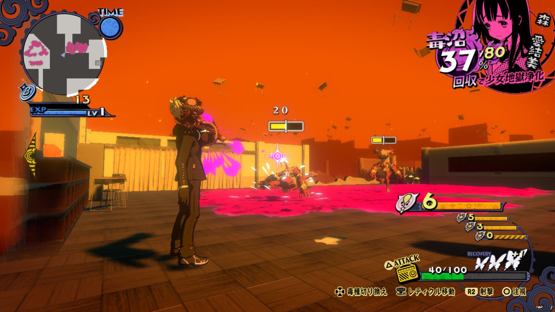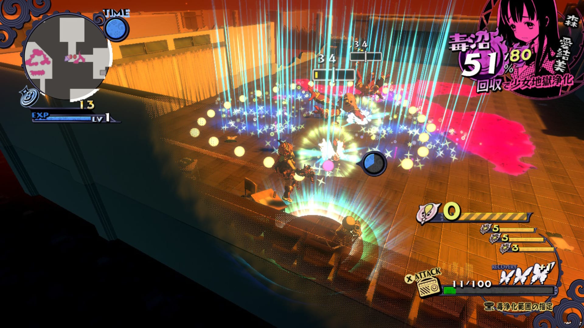 Attacking enemies is achieved by shooting poison. The basic shoot type is poison bullets, but there are other kinds that can be obtained by progressively purifying Hell. We also see different stages associated with different girls.